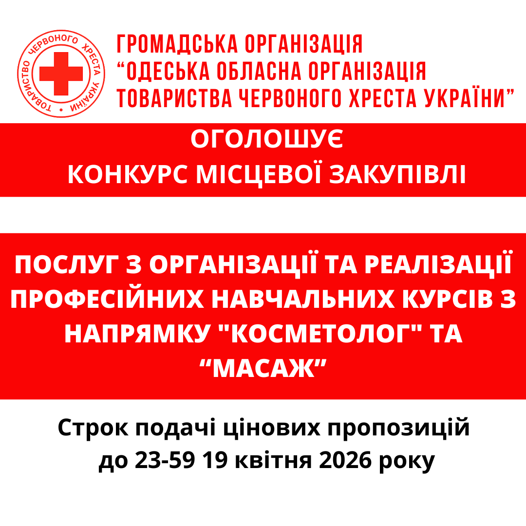 ГО «Одеська обласна організація Товариства Червоного Хреста України» оголошує конкурс місцевої закупівлі послуг з організації та реалізації професійних навчальних курсів з напрямку "Косметолог" та “Масаж” .