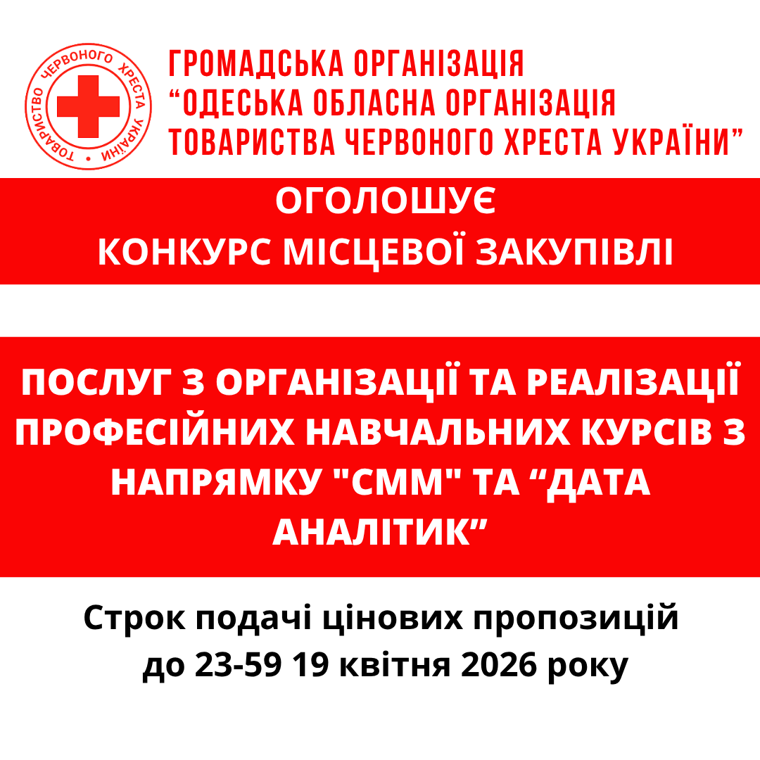 ГО «Одеська обласна організація Товариства Червоного Хреста України» оголошує конкурс місцевої закупівлі послуг з організації та реалізації професійних навчальних курсів з напрямку "СММ" та “Дата аналітик” .