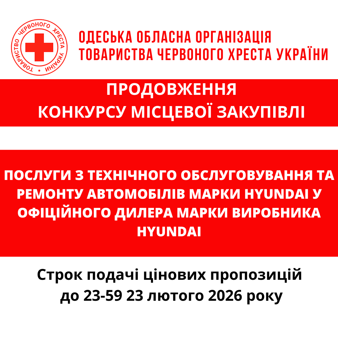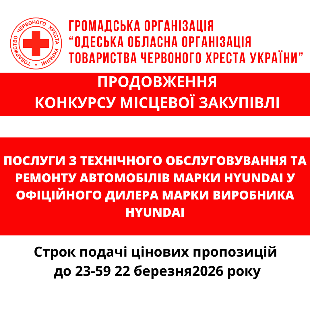 ГО «Одеська обласна організація Товариства Червоного Хреста України» оголошує продовження конкурсу місцевої закупівлі послуг з ТО та ремонту автомобілів марки Hyundai у офіційного дилера марки виробника Hyundai.