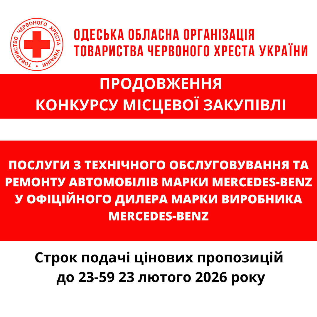 ГО «Одеська обласна організація Товариства Червоного Хреста України» оголошує ПРОДОВЖЕННЯ конкурсу місцевої закупівлі послуг з ТО та ремонту автомобілів марки Mercedes-Benz у офіційного дилера марки виробника Mercedes-Benz.