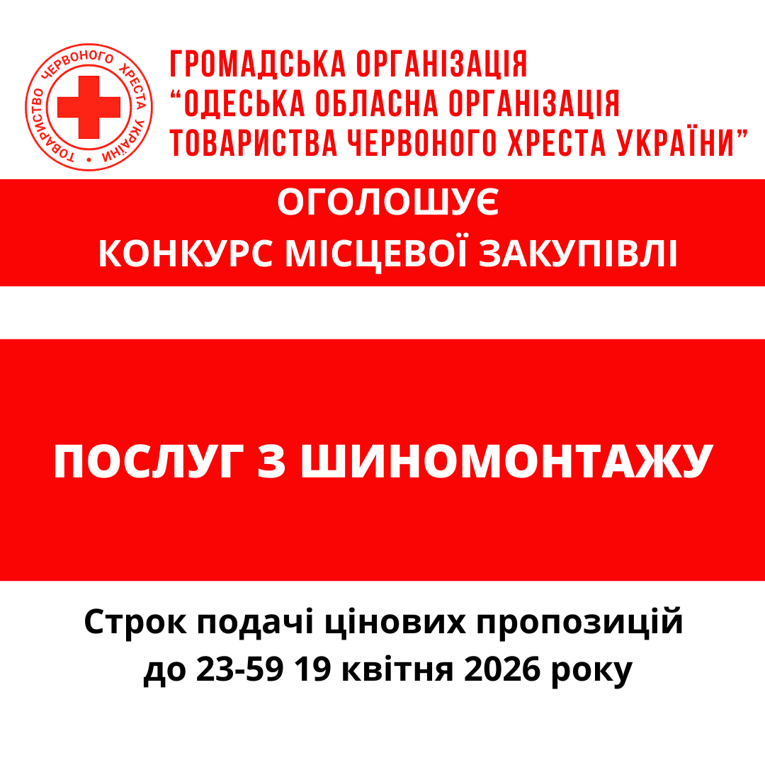 ГО «Одеська обласна організація Товариства Червоного Хреста України» оголошує конкурс місцевої закупівлі послуг з шиномонтажу.