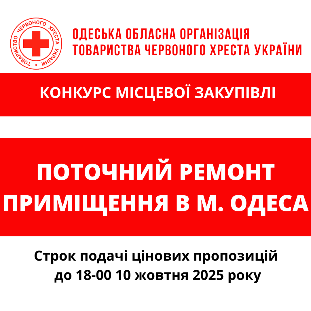 ГО «Одеська обласна організація Товариства Червоного Хреста України» оголошує конкурс на місцеву закупівлю робіт з поточного ремонту приміщення в м. Одеса.