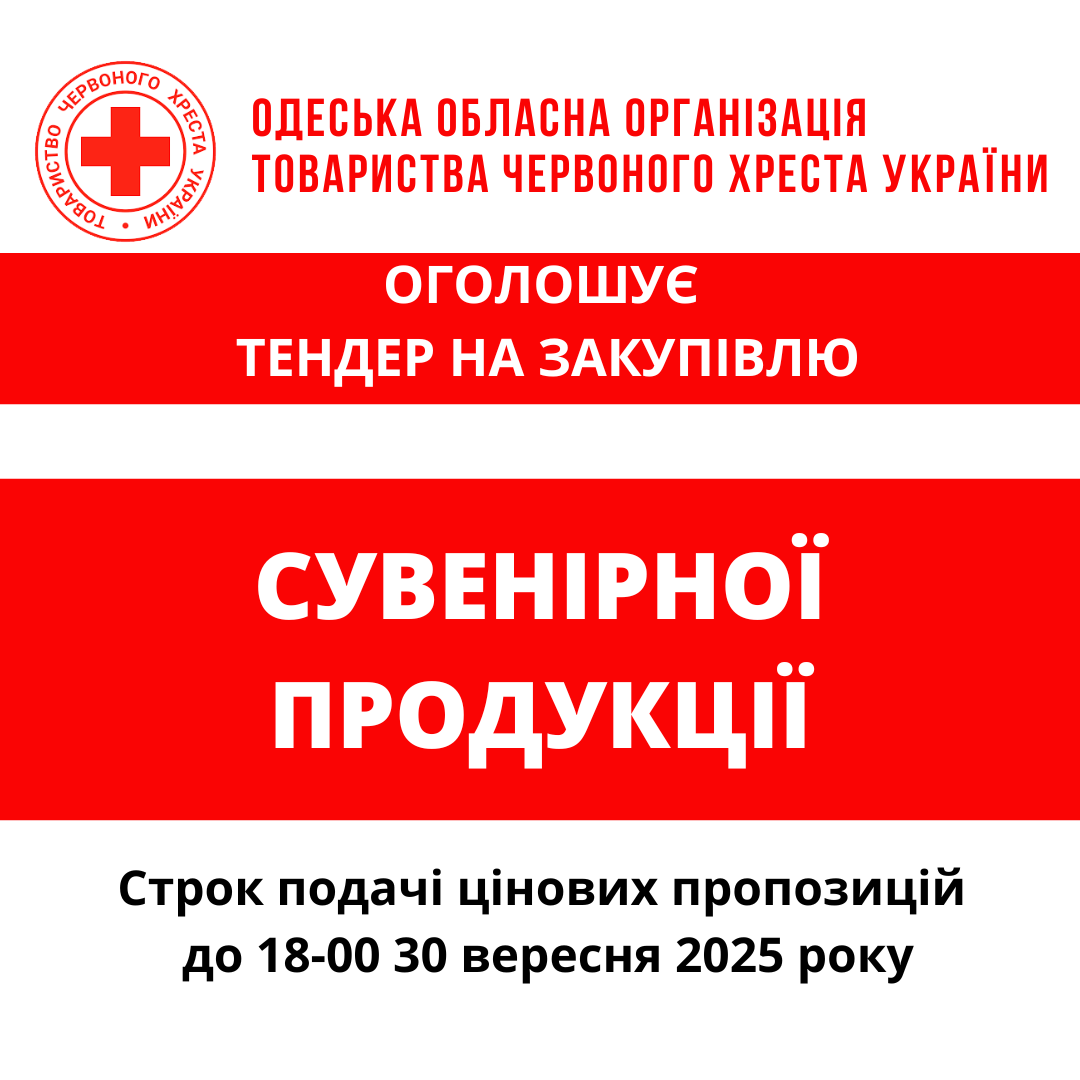 ГО «Одеська обласна організація Товариства Червоного Хреста України» оголошує тендер на закупівлю сувенірної продукції.